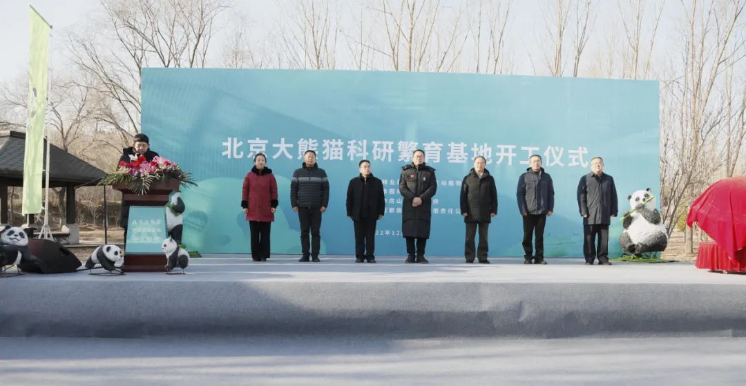 在开工仪式现场的甬路两侧,数十面道旗上都画有可爱的熊猫图案。施工平面图、展示效果图、内容分布示意图、项目定位等展板整齐摆放在场地内。随着挖掘机、推土机发出阵阵轰鸣,北京大熊猫科研繁育基地项目正式开工。